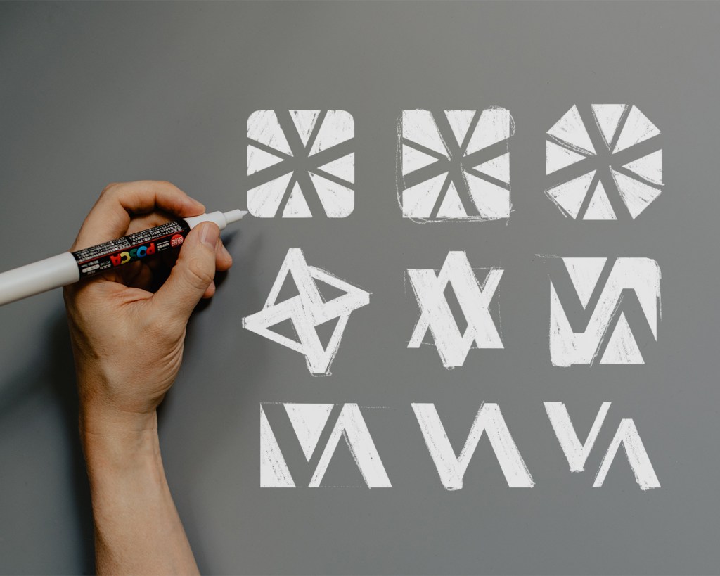 Para la propuesta visual, giré alrededor de la letra V buscando diferentes significados. El ejercicio de replica y rotación a través de tablas morfológicas (o cuadrículas) trajo a flote interesantes figuras con las cuales se podía conectar el concepto “versatilidad” como por ejemplo una V invertida que puede ser una A.